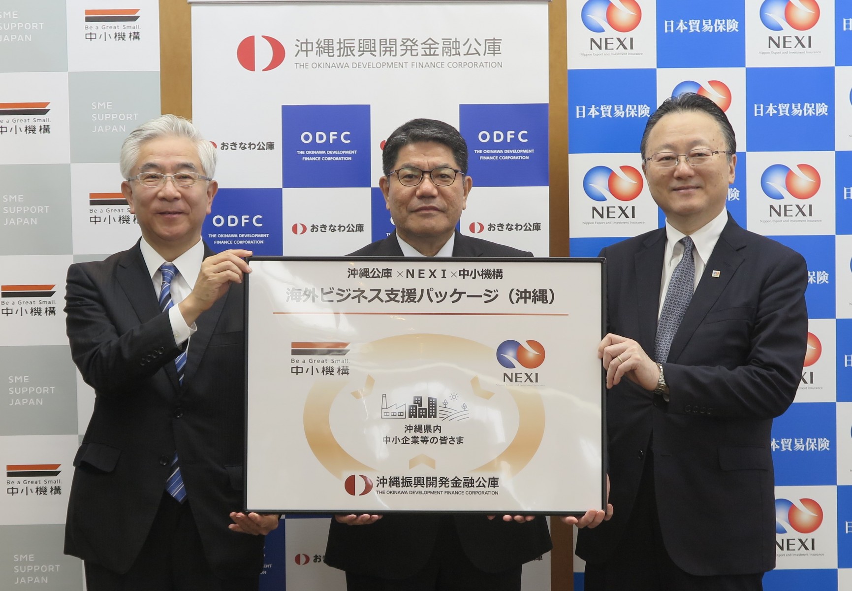 沖縄公庫は、令和6年11月に株式会社日本貿易保険(以下「NEXI」)、独立行政法人中小企業基盤整備機構(以下「中小機構」)と覚書を締結し、「海外ビジネス支援パッケージ(沖縄)」を構築しました。