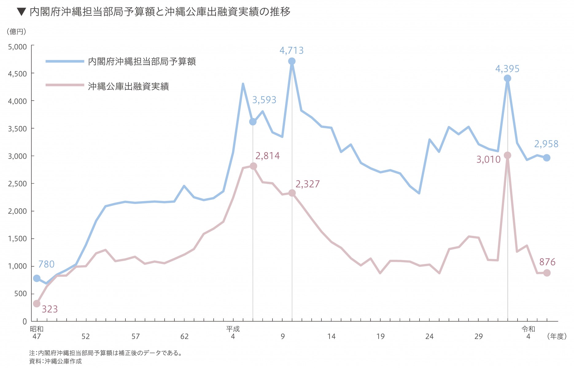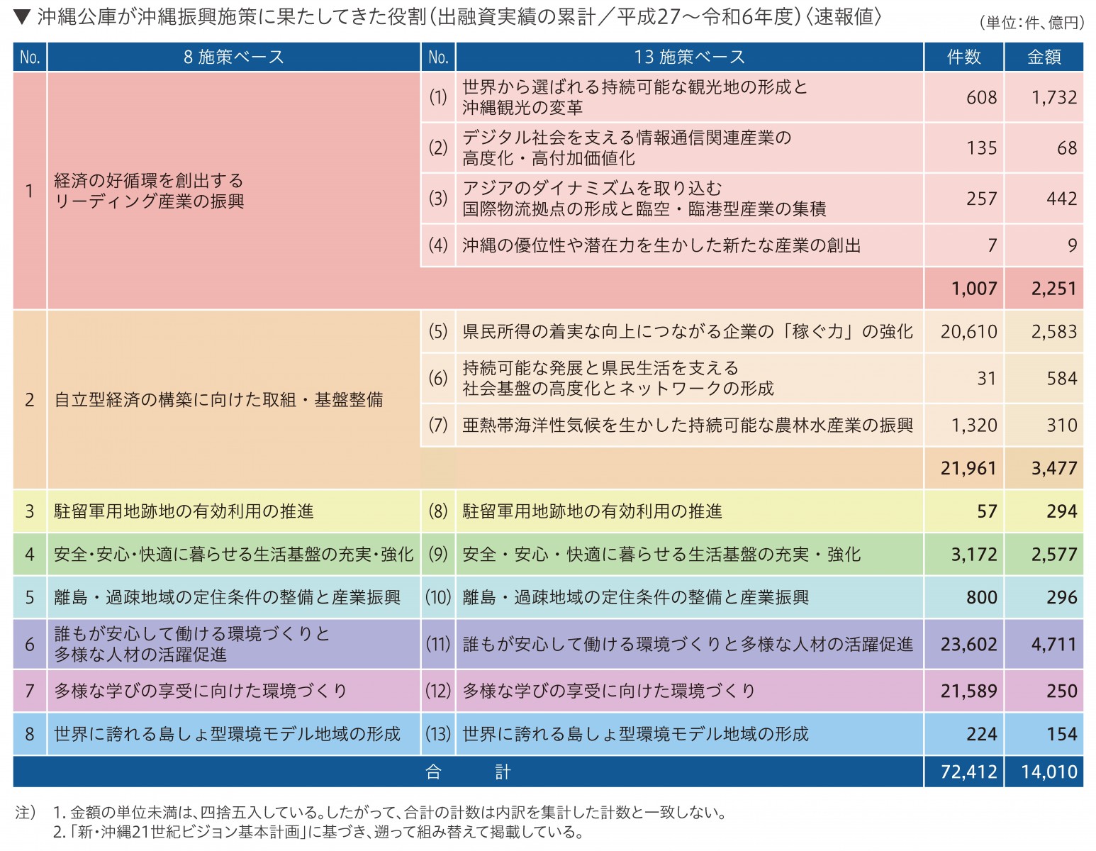 民間投資を支援する沖縄公庫の政策金融は、財政上の特例等による公共投資等の推進と並び、沖縄の振興開発における「車の両輪」として位置付けられます。