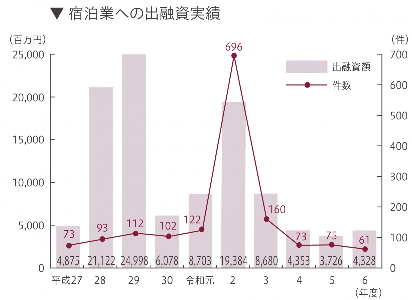 駐留軍用地跡地地区(桑江伊平地区、大湾東地区、大木地区、アワセゴルフ場地区、西普天間住宅地区)への事業系設備資金の融資実績は、平成27年度から令和6年度の累計で367件、187億73百万円となっています。