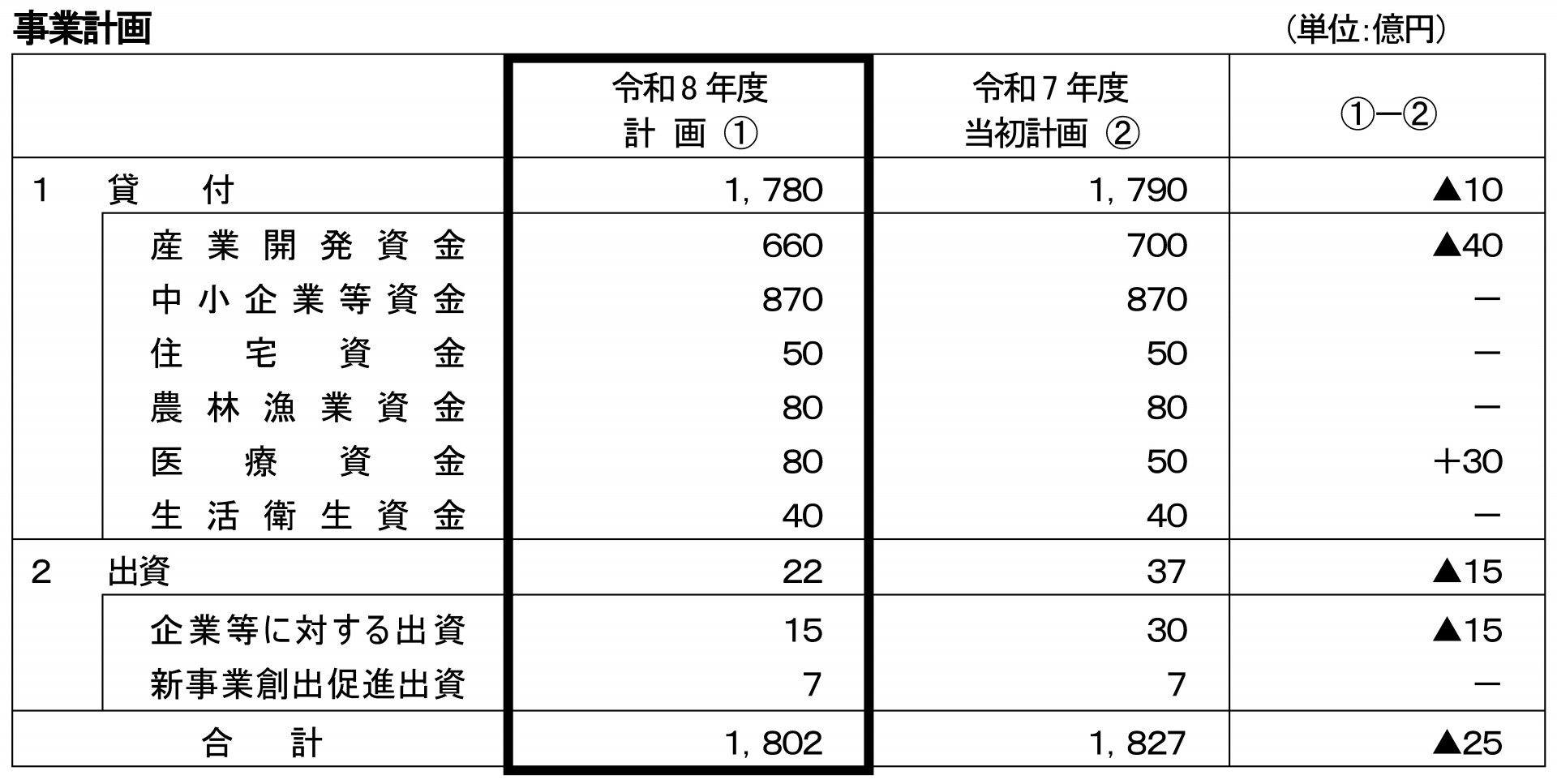 上記の重点項目を踏まえ、国や県の沖縄振興施策等に沿った資金需要への対応及びセーフティネット機能を発揮するために必要な事業規模(契約ベース)として、1,802億円を確保(令和7年度当初計画比25億円減)