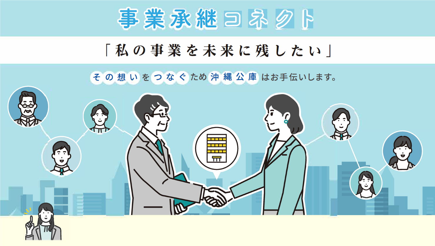 当公庫は、地域に密着したサービスや商品を提供する事業者を未来につなぐため、引継ぎセンターや商工会議所、商工会などの支援機関と連携しながら、事業承継に取り組む方をマッチングサービスと金融サービスの両面から支援してまいります。