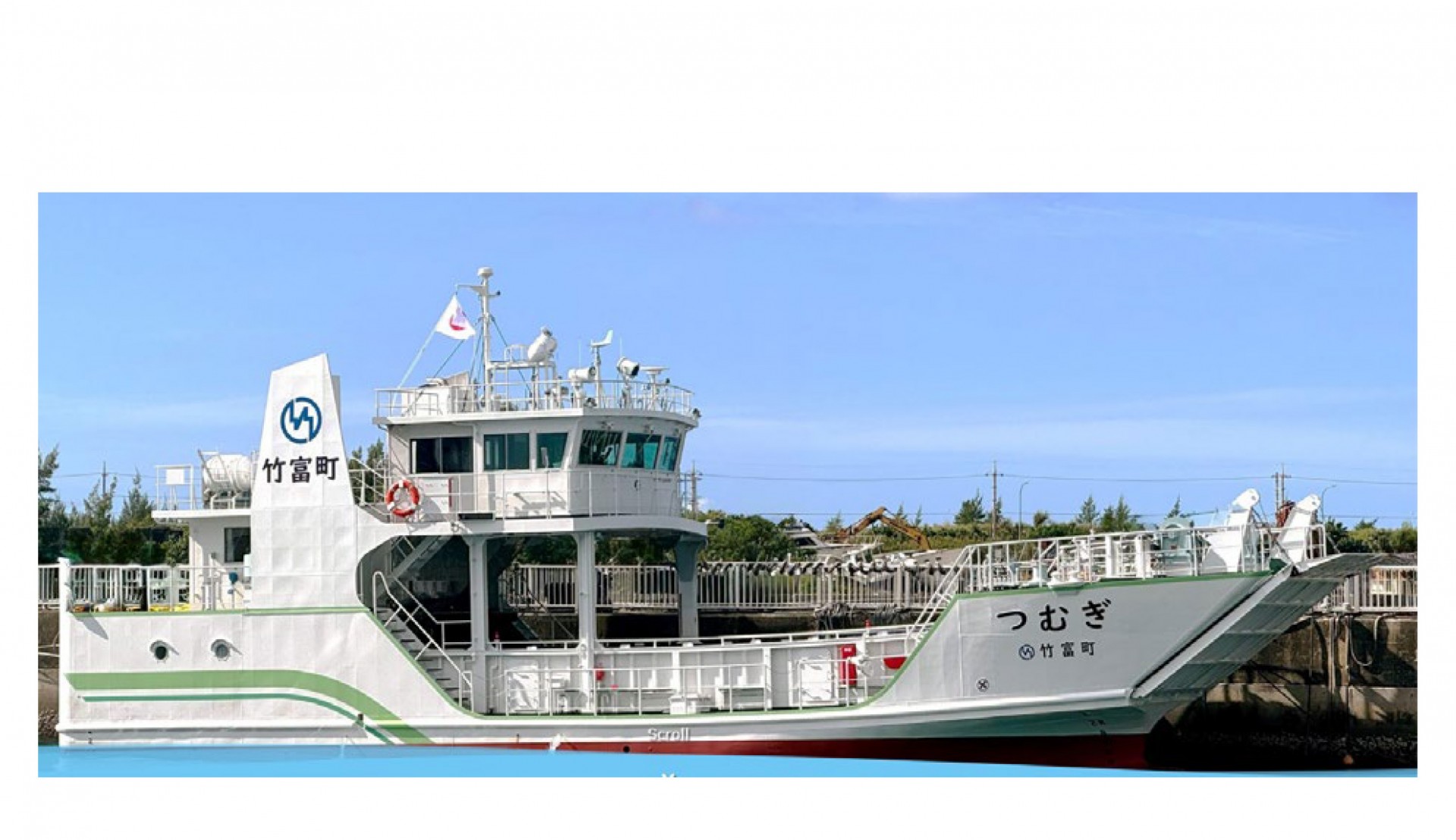 竹富町では農協丸の運航終了を見据え、後継船となる町有貨物輸送船「つむぎ」(以下、「つむぎ」)を建造し、当社は船舶の指定管理者として、令和7年11月より竹富町の島々を結ぶ海上貨物輸送事業をスタートさせました。つむぎは、従来運んでいた貨物に加え、ガスや石油といった危険物、大型車両・特殊車両の輸送等新たな役割も担い、島々の重要な物資を運搬しています。
