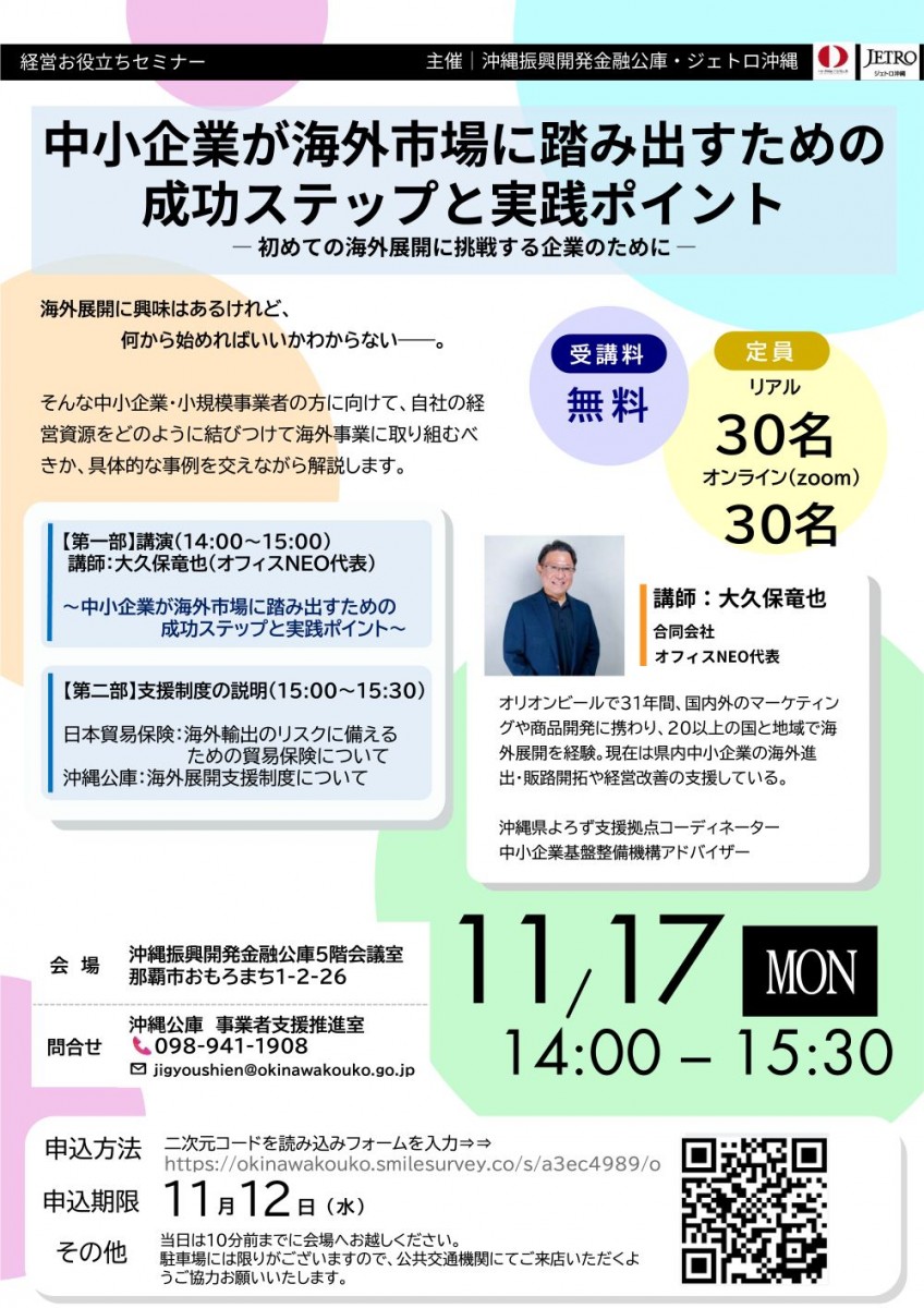 沖縄公庫・ジェトロ沖縄共催 海外展開セミナー「中小企業が海外市場に踏み出すための成功ステップと実践ポイント ~初めての海外展開に挑戦する企業のために~」